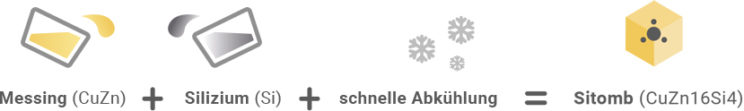 Für die Herstellung von Sitomb® wird Messing mit Silizium vermischt und anschließend extrem schnell abgekühlt. Bei hohen Temperaturen um 1000°C kann sich Silizium frei im Metallgitter bewegen. Sobald das Material jedoch rasch bis auf Raumtemperatur abgekühlt wird, werden die Siliziumatome auf genau definierten Positionen im Zwischengitter eingeklemmt und verspannen somit das Gefüge, was zu erhöhter Härte und Festigkeit des Bauteils führt.