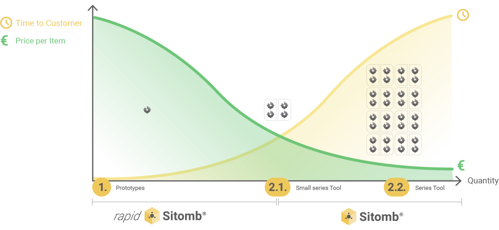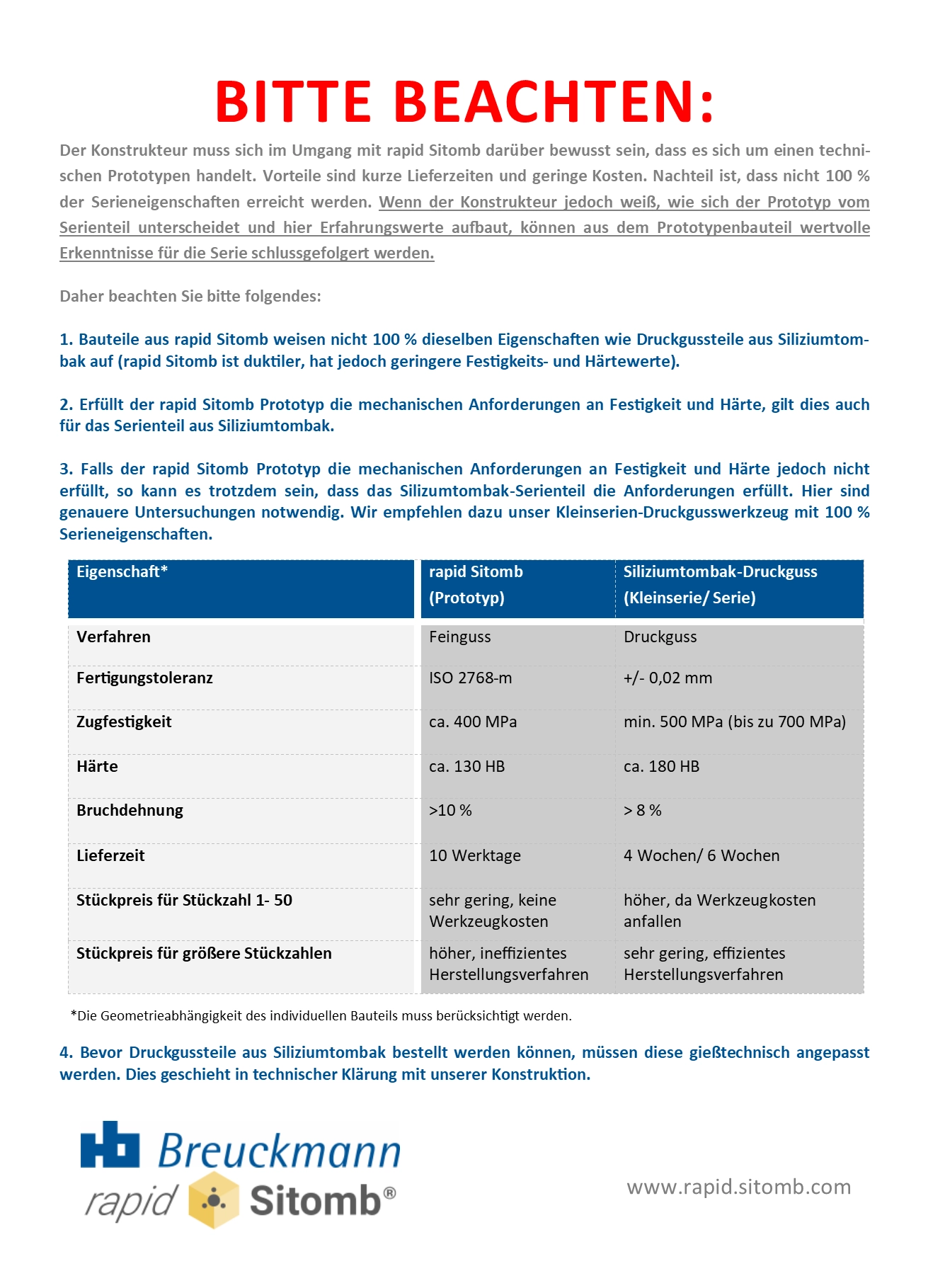 Wenn vor dem Seriengussteil aus Siliziumtombak bereits ein Prototyp aus rapid Sitomb nachgefragt wurde, so führt dies zu Vorteilen hinsichtlich der Schnelligkeit und der Qualitätsgüte bei der Überführung vom Prototypen in die Serienanwendung.